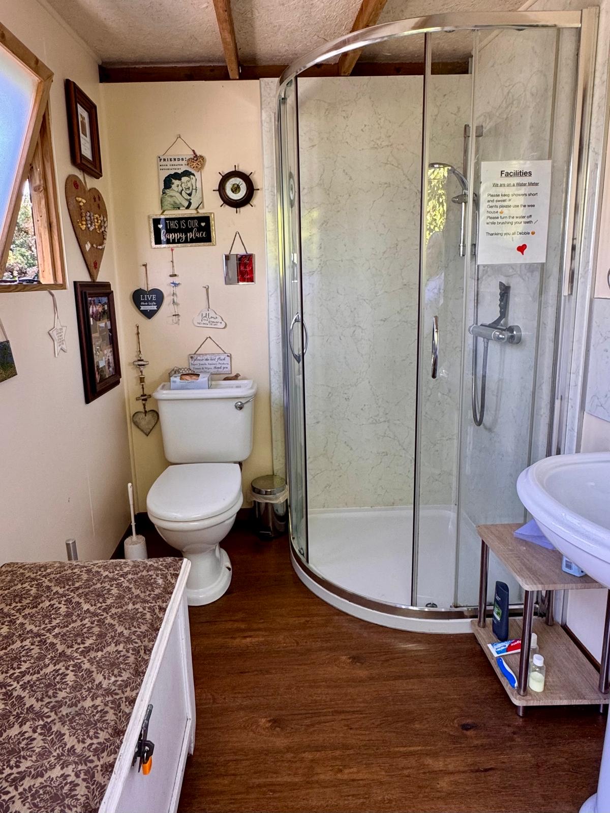 We also have glamping available via a stay in Holly Caravan. She offers a delightful glamping experience, boasting her own secluded pitch on the campsite, complete with a breathtaking sea view, a charming picnic table and a personal fire pit stocked with a complimentary bag of logs and a kindling starter pack for your inaugural blaze. Accommodating 2 guests, Holly features a snug double bed, thoughtfully made up for your arrival, alongside a sitting area where you can relish meals and unwind in comfort. Equipped with a gas hob, fridge, heater and all necessary cooking utensils and crockery, Holly ensures a pleasurable stay. Solar-powered lights and two USB sockets cater to your lighting and phone charging needs, respectively. For added convenience, Holly boasts a compact washroom with a basin. Please note that while Holly provides these amenities, she shares toilet and shower facilities with the rest of the campsite, ensuring your comfort and convenience throughout your stay.