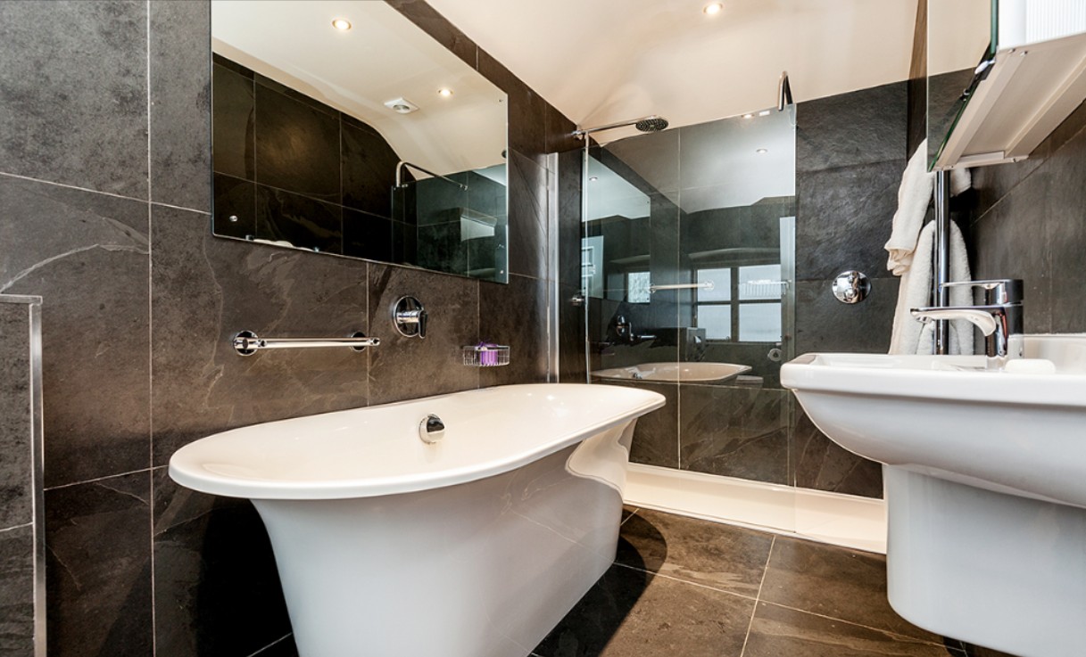 The dual-aspect lounge is bright and spacious, with solid oak flooring and views over the courtyard gardens and surrounding countryside. Guests can enjoy a woodburner for cosy evenings, along with a TV with Freeview, DVD player, stereo, iPod dock and a selection of books, CDs, DVDs and board games. The kitchen and dining area is equipped with a full range of Neff appliances, including an oven, microwave, hob, fridge, freezer, dishwasher and washing machine, with underfloor heating continuing through this space as well. The large bedroom features a luxurious 6ft Hypnos bed, oak furniture, a hair dryer and Freeview TV. The slate-tiled bathroom includes a generous walk-in shower, a freestanding bath, underfloor heating and easy-turn taps.