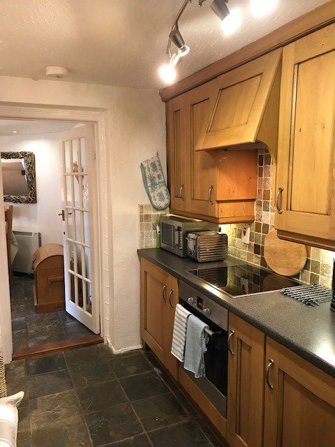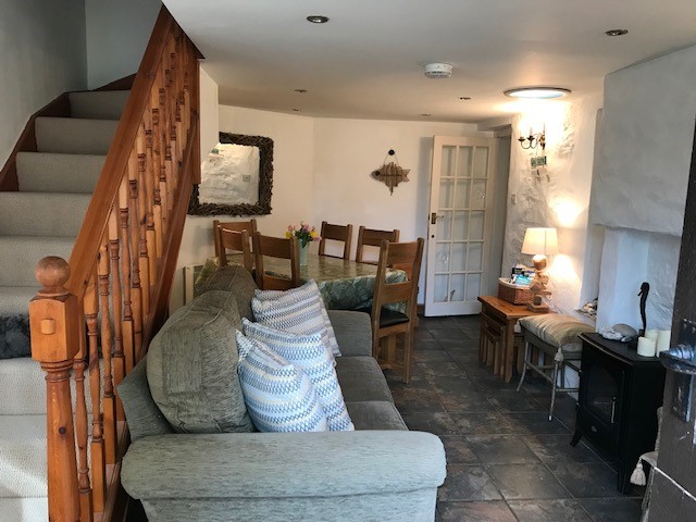 Inside, the open-plan sitting and dining room feels bright and spacious and leads into a galley-style kitchen fitted with units, an electric hob and fan oven, a fridge with a small freezer compartment and a good selection of utensils and crockery. The traditional main sitting room retains original features, including a Cornish slate inglenook fireplace with clome oven, beamed ceiling and stable door, giving the space plenty of historic charm.