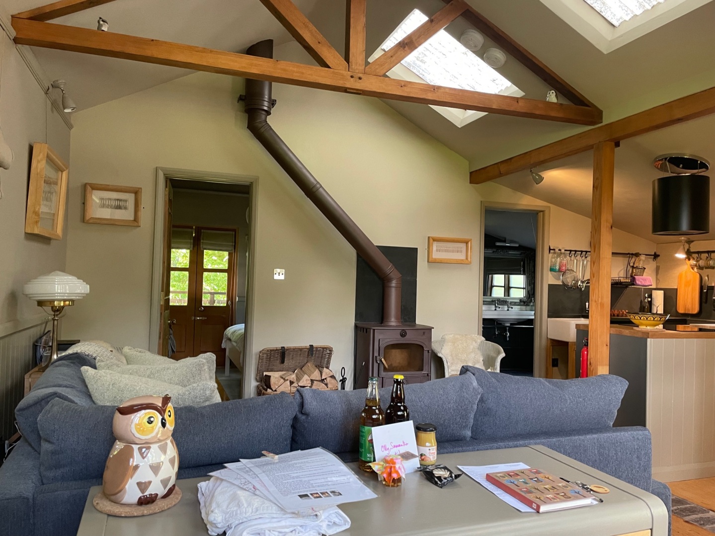 Owl Lodge is a characterful holiday retreat created from a former garage and game larder at the entrance to a 19th-century shooting lodge, set on the edge of a North Wales grouse moor. Originally transformed into a healing room and artist’s studio around 15 years ago, it now offers peaceful accommodation ideal for rest and restoration. Located close to Llandegla Mountain Bike Centre and the iconic Horseshoe Pass, it provides a perfect escape from everyday life, where you can soak in the hot tub while enjoying sweeping valley views, listen to owls after dark and watch small birds flitting through the surrounding trees. The lodge is all on one level and includes a double bedroom with a comfortable mattress and Egyptian cotton bed linen, as well as a sofa bed in the sitting room that converts into a king-size bed, with matching Egyptian cotton bedding stored in a cubby beneath the right-hand side of the sofa.