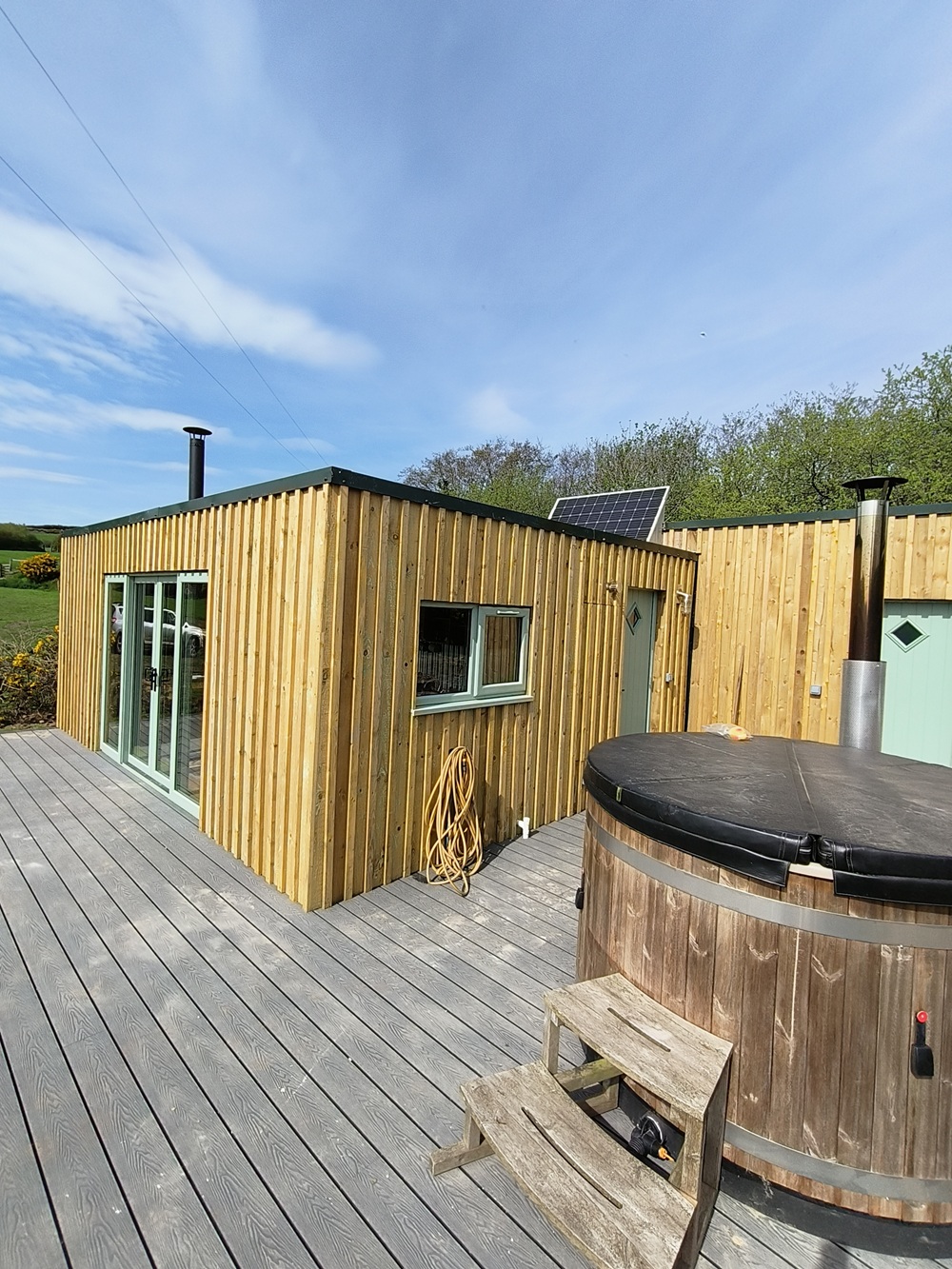 Drovers Hut: Our hut, built on an ex-army ammunitions trailer, sleeps up to 6 people. Facilities include a king-size bed, single bunks and a trestle bed which pulls out under the main king-size bed. The country kitchen comes with a Belfast sink, solid oak worktop, dresser top, two-burner gas hob, a table and benches and a wood-burning range stove with oven and hobs above. The kitchen is well equipped and adjacent is a private bathroom with a decking area which has two gates to secure it for dogs or children. Outside there is seating, a fire pit and BBQ. Ideal for al fresco dining.