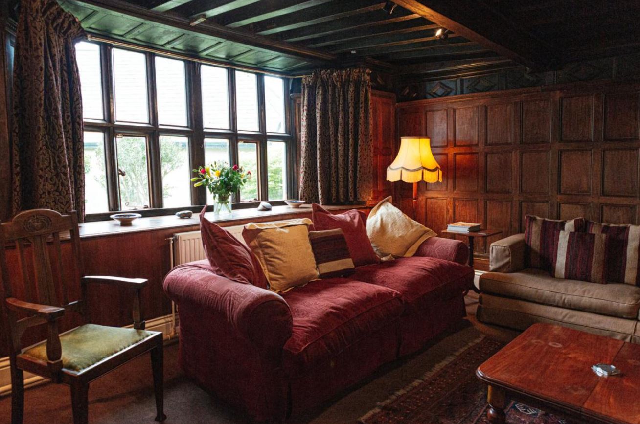 The Farmhouse comfortably sleeps up to 15 guests and is perfect for family gatherings or groups of friends. It features a spacious kitchen-diner with a large table seating everyone together and a modern range ideal for cooking for large parties. The historic drawing room, with its Jacobean wood panelling, oak-framed window overlooking the fortified garden and roaring open fire, offers a cosy space to relax with comfortable sofas and a walk-in wine store. The library serves as both a music and playroom, complete with a piano, TV, DVDs, WiFi and a wide selection of children’s toys and games. There are seven beautifully decorated bedrooms, three with en-suites and a family bathroom, all featuring period charm and antique furnishings. Twin beds can be converted into doubles and extra beds are available in two rooms, ensuring flexibility and comfort for every guest.