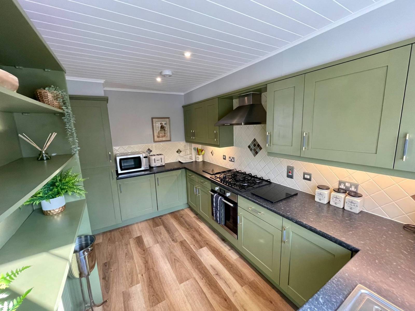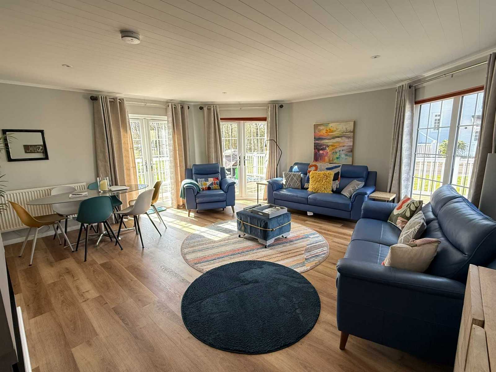 From the hallway, you enter the large, bright and airy open-plan living and dining area. This comfortable space is furnished with two large leather sofas and two single leather chairs, providing plenty of seating for everyone. The glass dining table seats up to six guests, making it perfect for family meals or relaxed dinners together. Guests can enjoy a selection of books, DVDs and games, while the media wall features a large 55-inch flatscreen TV with Sky Stream and Netflix options, along with surround sound for an enhanced viewing experience.