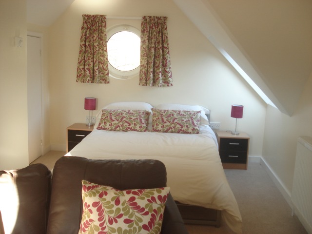 Grebe is a centrally heated, upstairs apartment finished to a high specification sleeping up to four people. It is a south facing, sunny and roomy apartment overlooking the lawn and lake. The kitchen is very well equipped with all you would expect to find. There is a fridge, ceramic hob, a large microwave with grill, toaster, kettle, iron and ironing board etc. Please note; there is no oven. Plenty of china, glassware and cutlery, cooking equipment and pots and pans for 4 people. Very well lit with spotlights and a extractor fan and plenty of cupboard storage space. Grebe has plenty of comfortable seating, both for dining in style and relaxing. The large futon in the living area easily converts into a full sized double bed. A large flat screen TV with all the Freeview channels including radio, sitting next to is a large wicker basket to store bedding for the futon. Grebe benefits form smoke and heat alarms for your safety. The bathroom has a washbasin, WC and bath with overhead shower and glass screen, fluffy towels, heated towel rail, plenty of hot water and shaver socket. You will find the comfy beds made up with Egyptian cotton bedding and tea towels in the kitchen area. There is no extra charge for heating or electricity and the radiators are individually controlled by thermostat should it get a little chilly. The view from the windows is across to the lake and dedicated large guests lawn, patio and children’s play area. We have garden furniture for your use and a BBQ is provided (please bring your own charcoal). We are part of the Cotswold Water Park and in an ideal place for exploring all the pretty nearby towns and villages. Near Fairford we are an ideally placed for the Royal Air Tattoo each year.