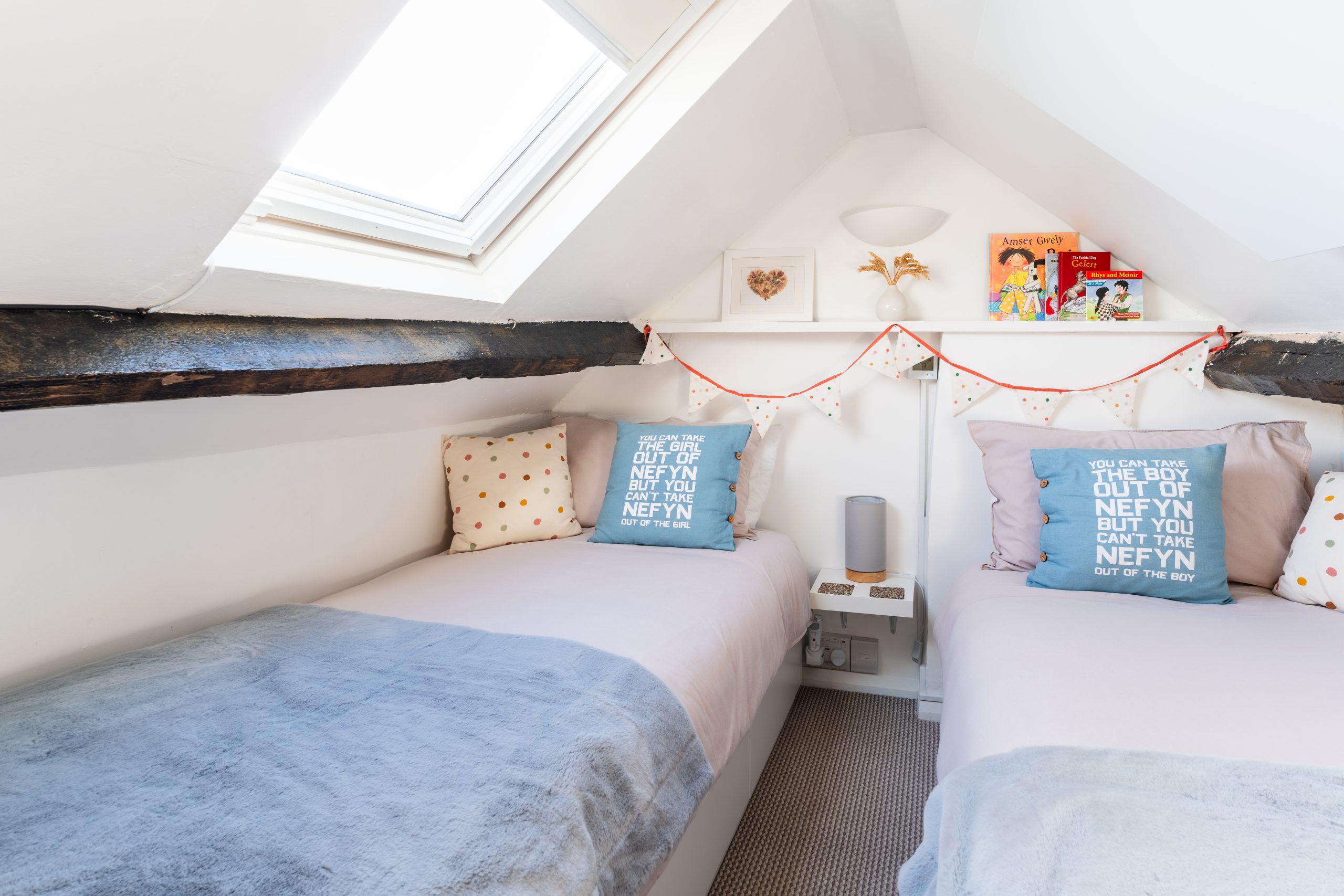 The first-floor bedroom offers a double bed with an infrared ceiling panel, a wardrobe with drawers, a chest of drawers, a wall-length mirror, bedside lamps and a hairdryer. On the second floor, the loft room includes two single beds with under-bed storage, an infrared ceiling panel, a retractable stair-gate, a bedside lamp and a selection of children’s books. Please note that access to this room involves winding stairs with a handrail and three bottom steps, which may not be suitable for very young children or individuals with reduced mobility.