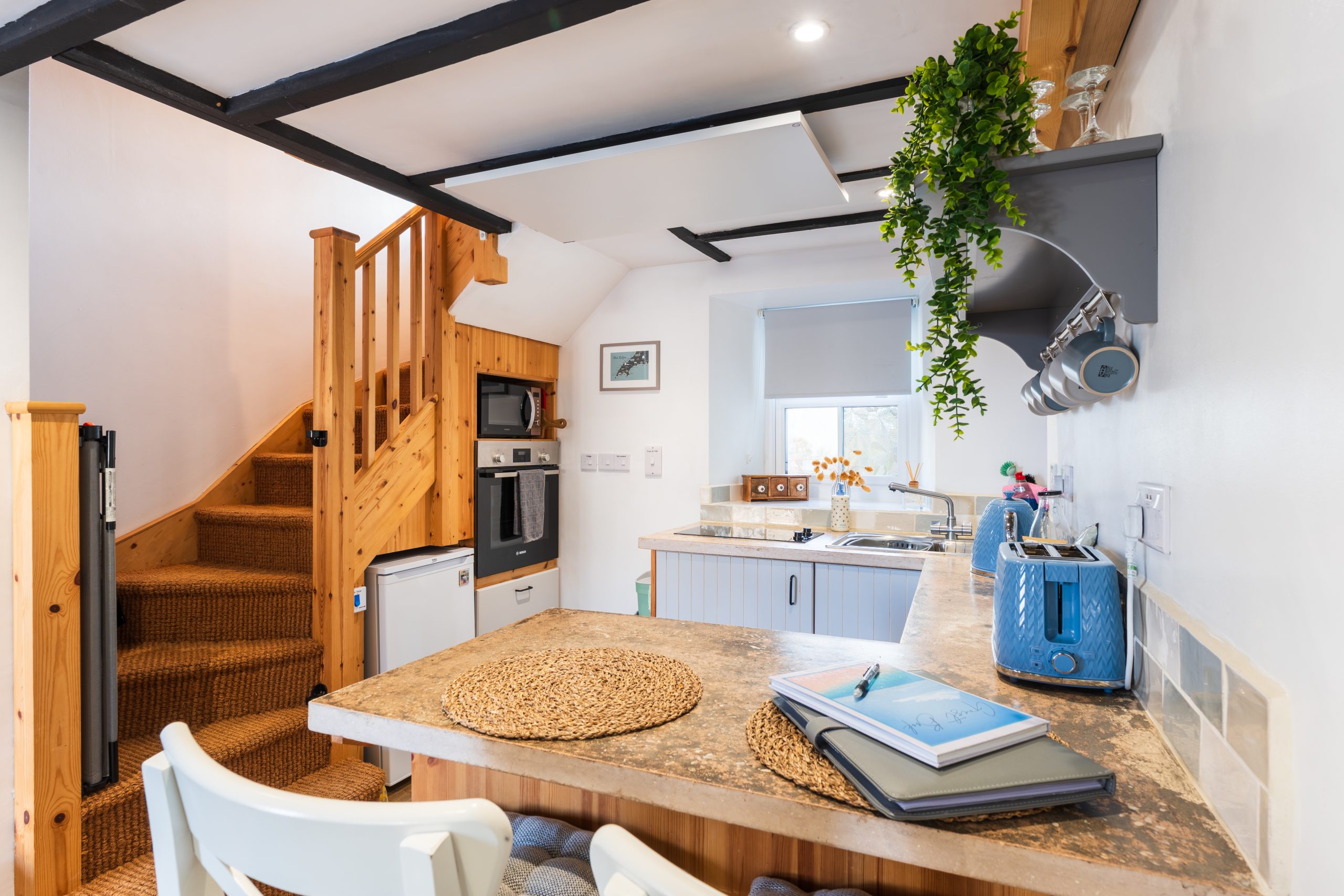 In the kitchen, guests will find an oven and grill, microwave, dual ring electric hob, kettle, toaster and a fridge. A selection of saucepans and cooking utensils is available for preparing meals. Additional features include a wall-mounted cordless vacuum, a retractable stair-gate and an infrared ceiling panel for comfort.