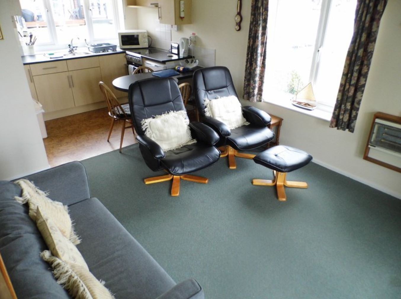 In total, there are 2 bedrooms: 1 double and 1 twin, both with Freeview TV/DVD players. The bedrooms share a bathroom with a walk-in shower cubicle.