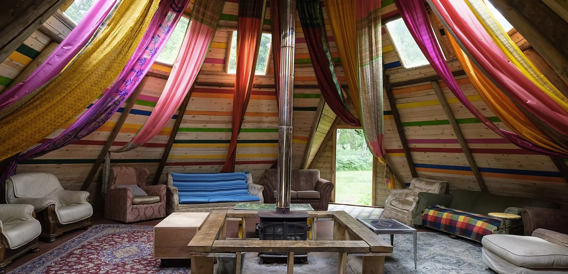Zenia is a favourite among visitors. Created from a reclaimed boat hull salvaged from Blakeney, this enchanting hideaway sleeps four and features bunk-style beds accessed via ladders, a French stove, a table and vintage theatre seating, all under a curved wooden roof that sparks the imagination. For larger groups, the Dorm Teepee provides warm, communal accommodation with beds for eight and a central wood-burning stove. A second teepee serves as a common room, ideal for socialising on cool or damp evenings.