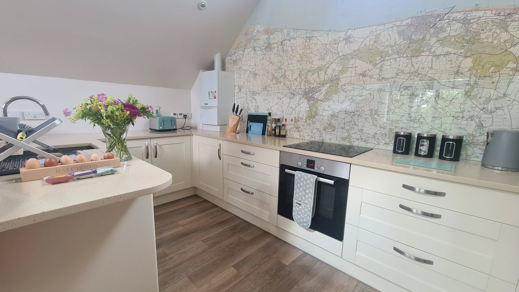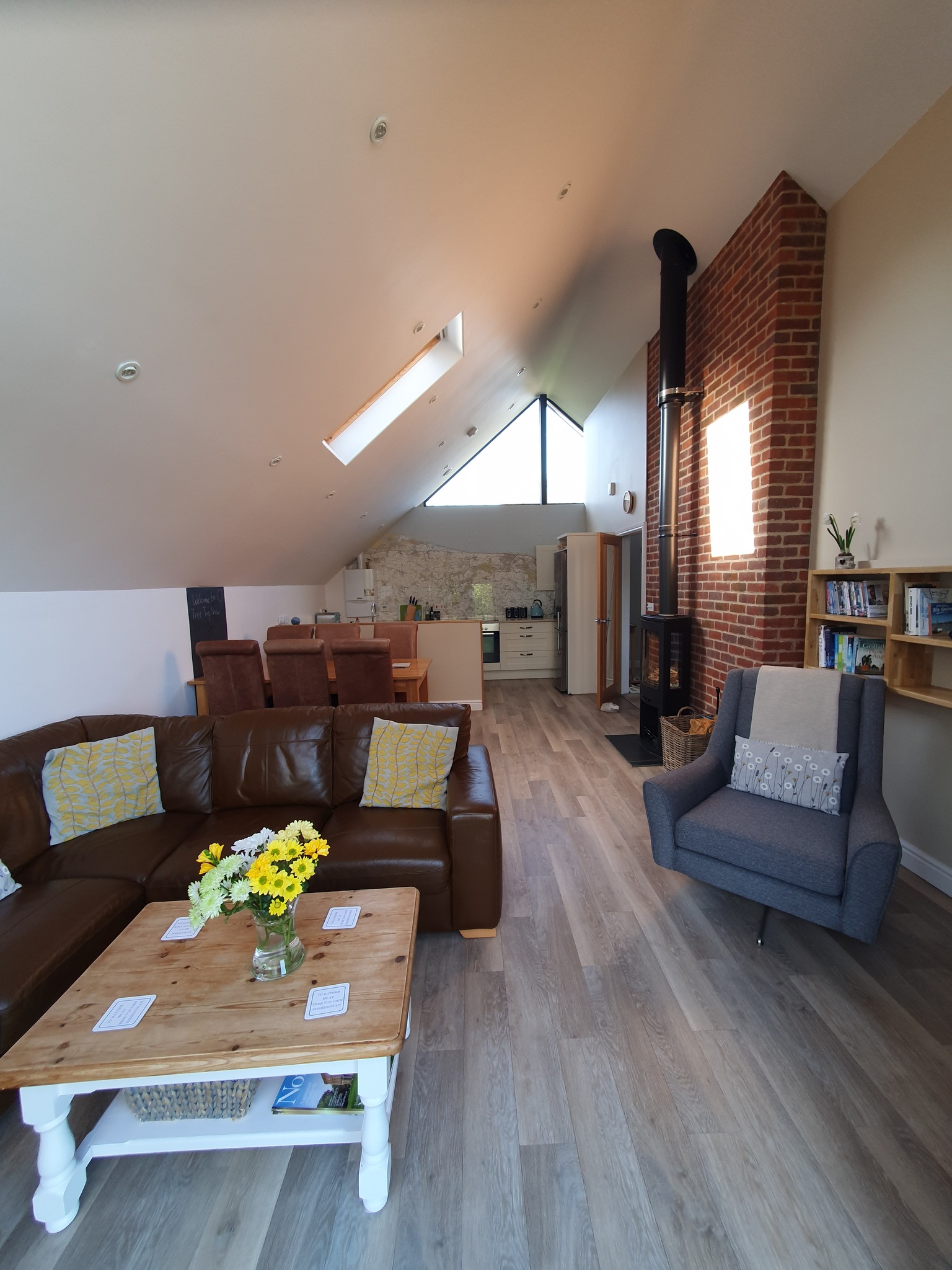 Upstairs features a vaulted open-plan lounge, kitchen and dining area, along with a bathroom, all accessed from a striking vaulted landing. The lounge is bright and airy, with underfloor heating throughout and a three-sided wood burner creating a cosy focal point. Bi-fold doors open to a Juliet balcony, perfect for wildlife spotting and enjoying the views. There is a 40-inch Smart TV, Alexa smart speaker and Wi-Fi with approximately 35 Mbps download speed, while an Ordnance Survey feature wall helps you plan days out in the surrounding area. The kitchen is fully equipped with an electric cooker and hob, dishwasher, fridge, freezer, microwave, four-slice toaster, kettle, slow cooker and ice bucket. A dining table with six chairs sits opposite the wood burner and chalkboard wall and a high chair and booster seat are available on request. The upstairs bathroom includes a large dual-ended bath with woodland views, an integrated blind within the window, WC and basin.