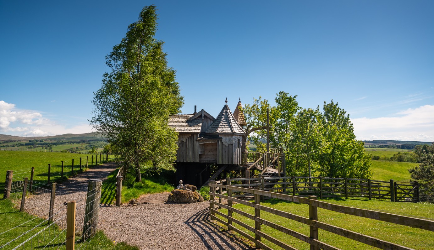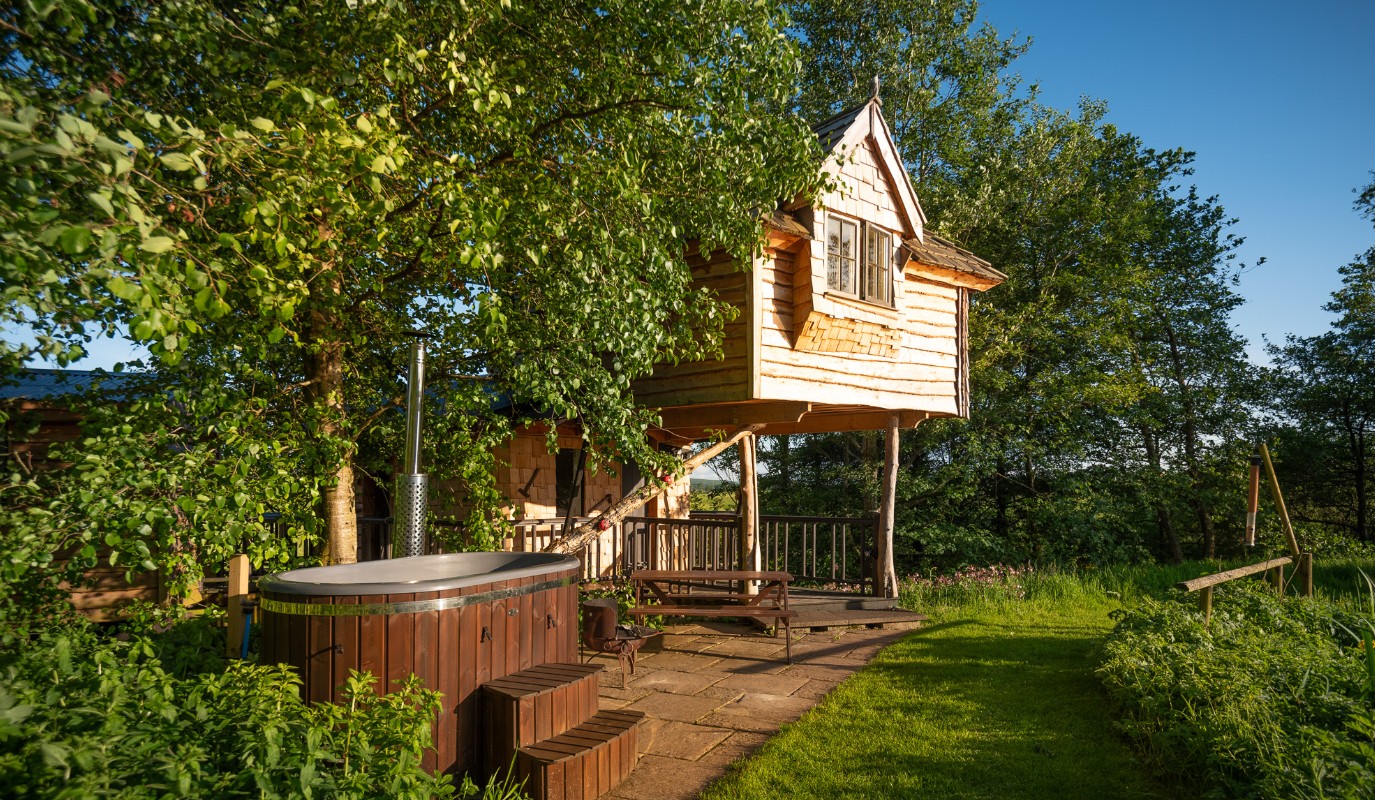 Ash Tree Howf is a beautiful handcrafted treehouse designed for a cosy escape. Inside, there’s a rustic king-size bed with bedside lighting and a large stargazing window above, a wood-burning stove with a glass door and a compact kitchen with a two-ring gas hob, oven, fridge and all essential cookware. A hot shower and wash basin are built in and a hair dryer is provided in the separate wash area due to limited electricity. The treehouse also features an antique Belfast sink, an eco-friendly compost toilet downstairs and a wood-fired hot tub available for an additional charge. Outside, a stunning viewing platform with sweeping views and a heart-shaped table creates a romantic setting, while steps lead to a private grassy area with a fire pit and barbecue.