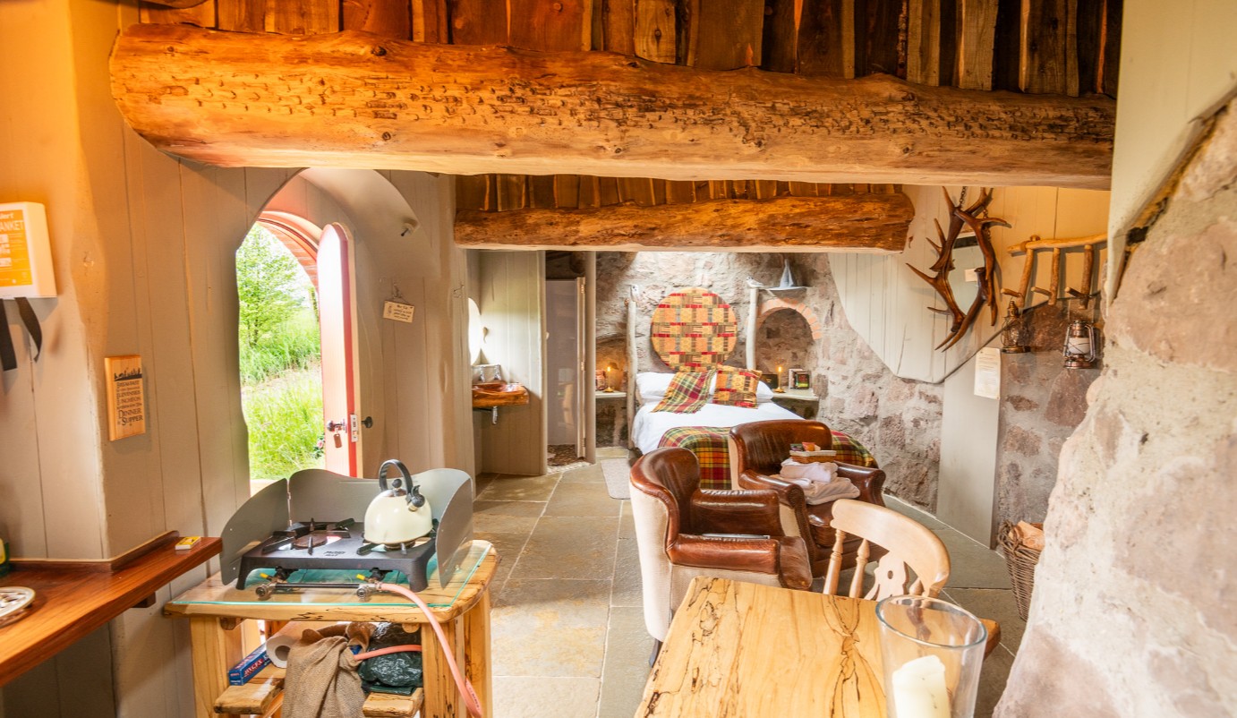Blending beautifully into the landscape, Bag End feels like a storybook hideaway, with a turf-covered roof, rolling countryside views and handcrafted details throughout. This off-grid retreat is traditionally built from stone and wood and full of cosy character. Inside, there’s a rustic double bed with linens and towels, a stargazing window, a wood-burning stove and a simple kitchen area with a double gas hob and essential cookware, along with bespoke hand-carved wooden sinks. A slipper bath with hand-held shower and carved basin sits inside, while a designer eco compost toilet is housed in a separate small hut nearby. Outside, a fire pit and barbecue offer the perfect spot to relax and take in the views.