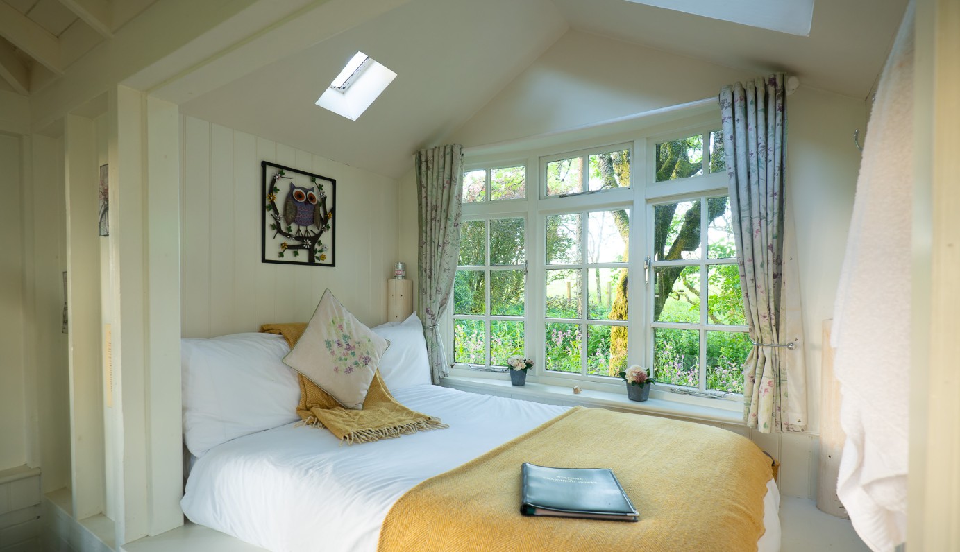 This charming off-grid hideaway, built in a traditional style from stone and wood, is full of character and tucked into a spot with beautiful views in every direction. Inside, you’ll find a handmade rustic double bed with linens and towels, a stargazing window overhead and a wood-burning stove for cosy nights. The compact kitchen area has a double gas hob, essential cookware and handcrafted wooden sinks. Bag End also includes a slipper bath with hand-held shower and a carved wooden basin, while a separate eco compost toilet sits in its own small hut nearby. A fire pit and barbecue make outdoor evenings easy.