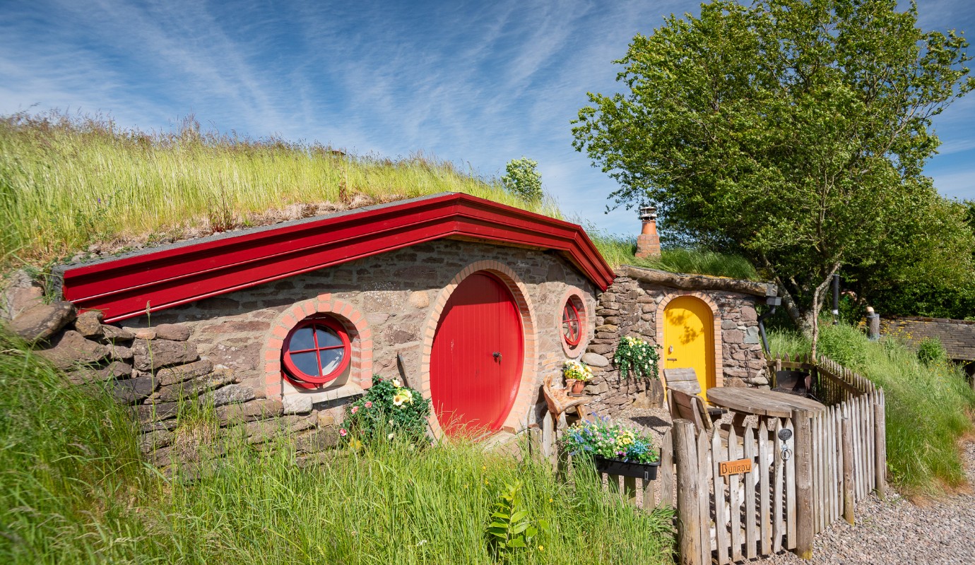Built in a traditional style using stone and wood, this off-grid hideaway is full of cosy nooks and crannies and surrounded by stunning views in every direction. Inside, there’s a handmade rustic double bed with linen and towels included, a stargazing window above the bed and a wood-burning stove for warmth and atmosphere. The kitchen area features a double ring gas hob along with crockery, cutlery, pots and pans, complemented by bespoke hand-carved wooden sinks. The Burrow includes a shower and a hand-carved wooden wash basin, while a designer eco-friendly compost toilet is located in its own small ‘wee’ howf next door, also with a carved wooden basin. Outside, a fire pit and barbecue offer the perfect setting for evenings under the sky.
