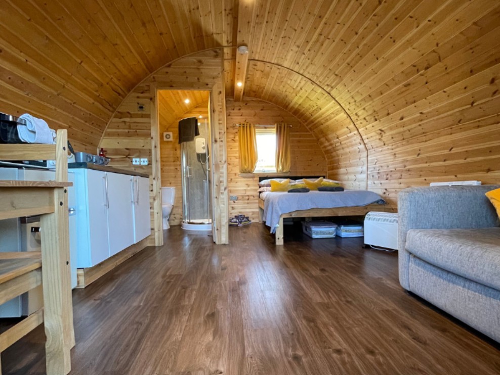 Each pod is fully equipped for a comfortable stay, featuring a double bed, sofa bed, kitchenette and a private shower room with WC. Outside, you can unwind in your own seating area complete with a BBQ, firepit and, in selected pods, a private hot tub. Designed to sleep up to four guests, the pods also include a Smart TV, free WiFi and all linens, giving you everything you need for a cosy and stress-free glamping break.