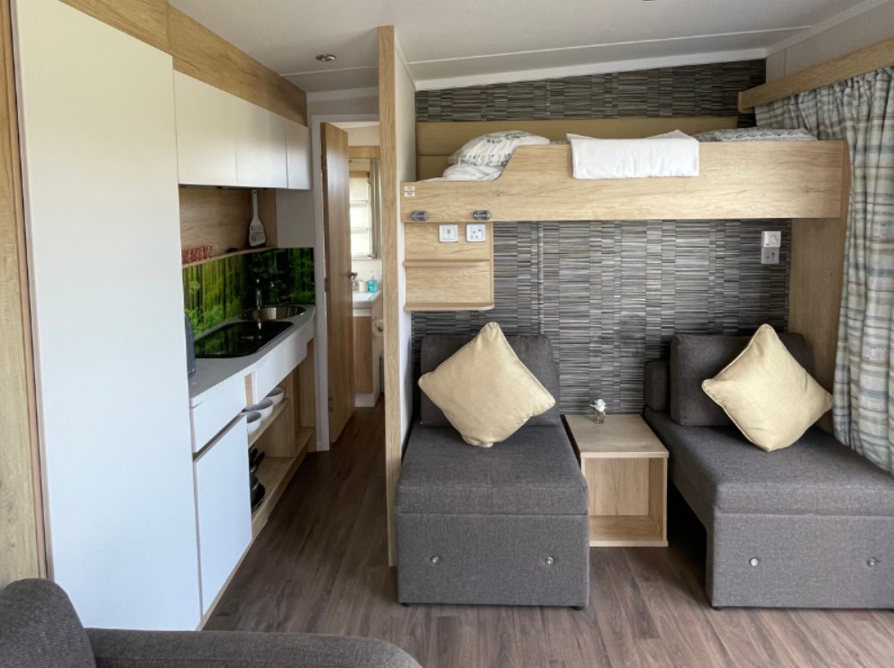 The Four S-Pod 4 is a modern, fully self-contained holiday unit designed for flexible and comfortable living. Well insulated and thoughtfully laid out, it offers everything needed for a relaxing break, including a practical kitchenette, private washroom and sleeping space for up to four guests. The open-plan interior makes smart use of space, featuring durable yet stylish furnishings complemented by warm woodgrain finishes and natural-look flooring for a cosy feel. Outside, a decked and railed area with patio furniture provides the perfect spot to sit back and enjoy the fresh air.