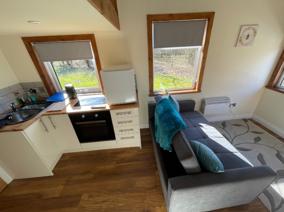 Our Tree Top is a charming “tiny house” that combines all the comforts of home with a cosy, compact design. Styled in a modern shabby chic finish, it provides a relaxing space to unwind. Inside, you’ll find a fully equipped kitchen with a full-size cooker, microwave, small fridge, kettle and toaster, along with a comfortable lounge area and TV. The property sleeps two adults and two younger children, with a sofa bed downstairs and a double mattress in the upstairs attic-style sleeping area. A full shower room with toilet and wash hand basin completes this cleverly designed and welcoming retreat.