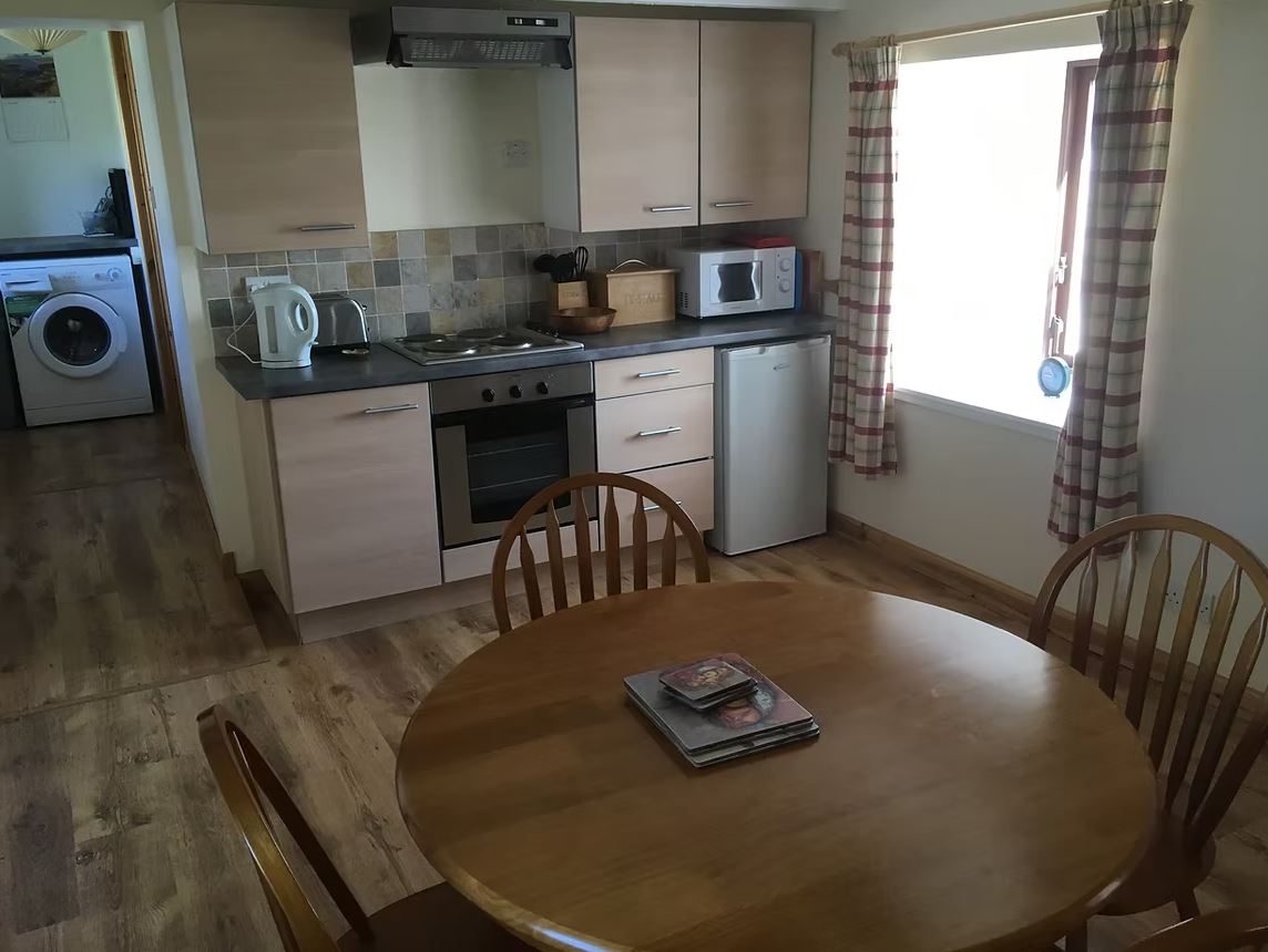 The sitting room / kitchen of the cottage features an open-plan layout with two double seater leather sofas, a coffee table, TV unit with TV and DVD player in the sitting area. The kitchen area includes a table with four chairs, a worktop area with built-in oven and hob, as well as a microwave and fridge. A utility room is equipped with a sink and washing machine. The bathroom is furnished with a bath with shower overhead, a sink, toilet, electric towel rail and a small cabinet. The first bedroom offers a double bed, two bedside cabinets, a wardrobe, a long mirror, a hairdryer and an alarm clock. The second bedroom includes two beds, two bedside cabinets, a wardrobe and an alarm clock. Bed linen, towels, WiFi and electricity are all included in the rental price.